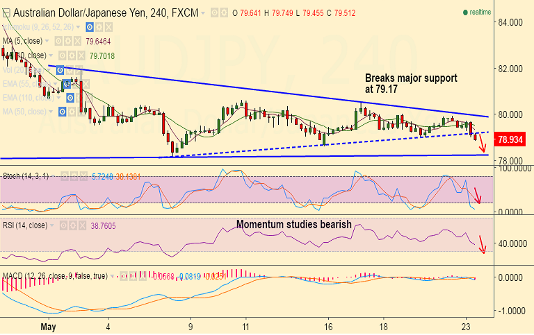 - AUD/JPY has broken major support at 79.17 and has fallen below the 79 handle to currently trade around 78.93 levels.