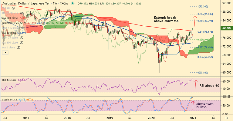 AUD/JPY trades with a strong bullish bias. The pair has shown a break above 21W MA and is on track to test 110 month EMA at 81.47.