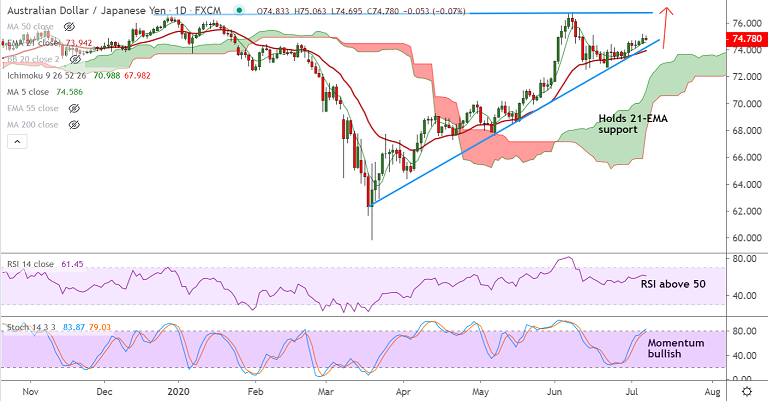 AUD/JPY was trading largely rangebound at 74.77 at around 06:25 GMT, outlook remains bullish.
