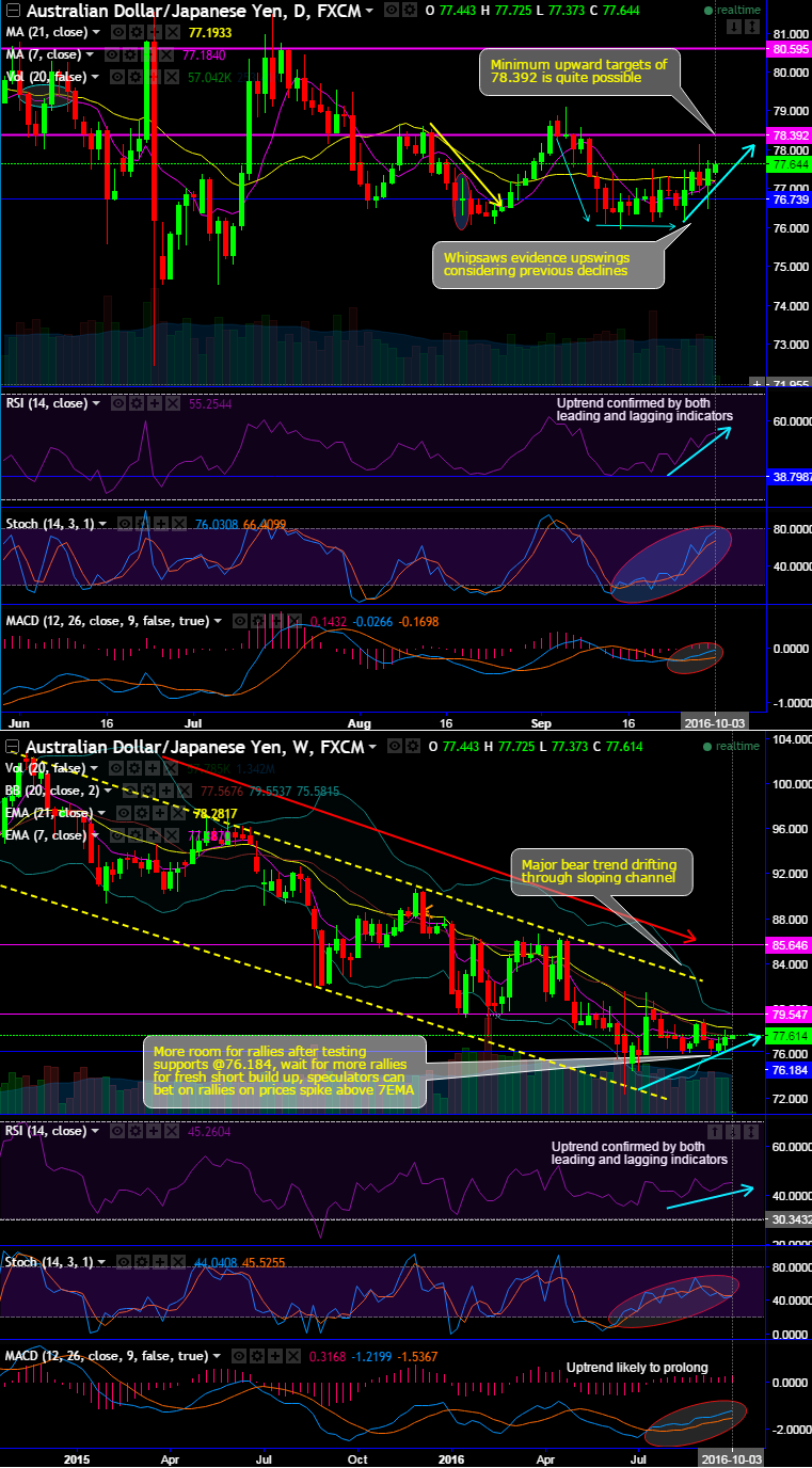Ever since AUDJPY tested support at 76.075 levels, the swings have gone in whipsaws pattern, considering the previous declining trend, the price has spiked above DMAs on the daily chart.