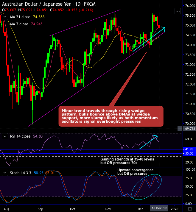 AUDJPY minor trend has been travelling through rising wedge pattern, while the interim bulls have extended the upswings from December lows of 73.825 levels upon wedge support as they bounce above DMAs, (refer daily plotting). But from the last 3-4 days, bears are attempting to nudge below 7-DMAs.