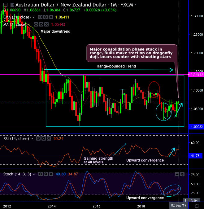 AUDNZD has been oscillating between 1.1425 and 1.0025 levels from last 5 years. The upswings, from the last couple of days, are targeting 1.0685 levels with potential for even higher. The main driving forces at this juncture, is the reversal of NZ-AU yield spreads following the RBNZ’s shift to an easing bias (while the RBA remains neutral). AU economic data has been strong too (retail sales, trade). There’s little major economic news out this week, apart from consumer confidence.