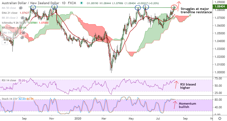 AUD/NZD has ignored a 'Doji' formation in the previous session and is extending upside.