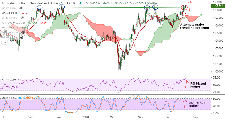 The pair is attempting major trendline breakout at 1.0830, technical studies support upside.