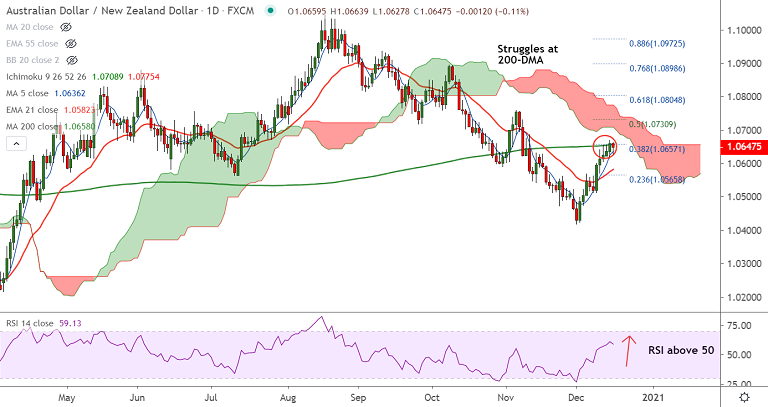 AUD/NZD has paused upside at 200-DMA which is stiff resistance at 1.0658. Technical outlook for the pair remains bullish.
