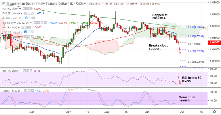 AUD/NZD breaks below daily cloud, opening up downside in the pair.
