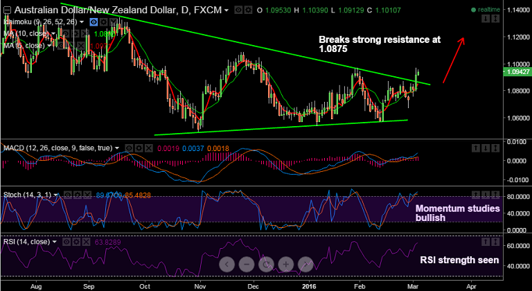 AUD/NZD has been trading a symmetrical triangle pattern and the pair has broken strong resistance at 1.0875 (triangle top).