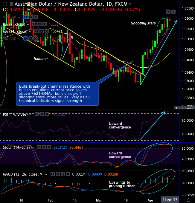 Chart and candlestick patterns formed: The AUDNZD bullish streaks have been shrugging-off shooting star patterns at 1.0545 and 1.0559 levels, and attempting to continue upon bullish engulfing in the minor trend and dragonfly doji patterns on the major trend.