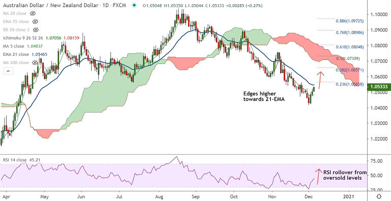 AUD/NZD was trading 0.28% higher on the day at 1.0535 at around 09:15 GMT, bias is turning bullish.