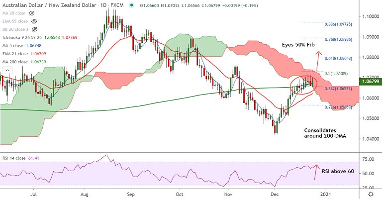 AUD/NZD was trading 0.22% higher on the day at 1.0683 at around 11:00 GMT, bias bullish.