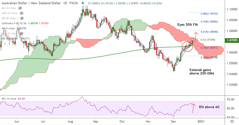 Summary: AUD/NZD trades with bullish outlook. Pair is on track to test 50% Fib at 1.0730 ahead of 61.8% Fib at 1.0804. Bullish invalidation on retrace below 200-DMA.
