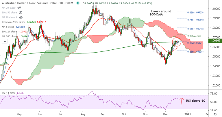 The pair trades with a bullish bias. Price action has paused upside at stiff resistance at 200-DMA at 1.0662. Decisive break above will fuel further gains.