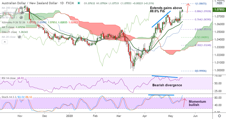 The pair has brushed aside a 'Doji' formation in the previous session and is extending gains above 88.6% Fib.