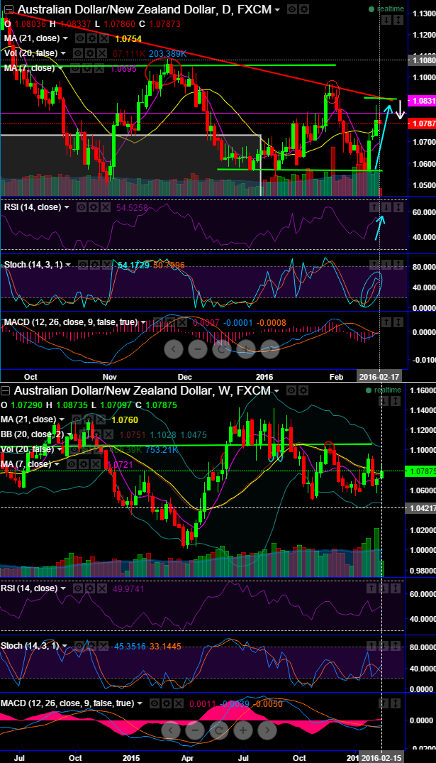 Aussie dollar after 1st half of February's losing streak upto the bottom at 1.0570 that had begun from the formation of back to back shooting star patterns at peaks of 1.0927 and 1.0914 levels, it is now making an attempt of recovery from last three consecutive days as both technical and fundamental indicators are signaling buying sentiments.