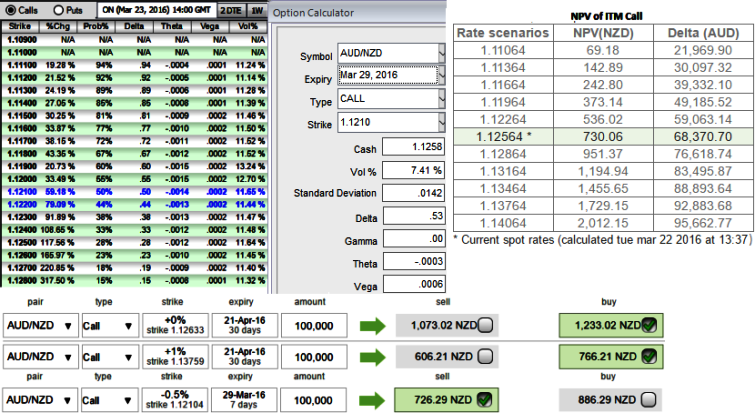 At spot ref: 1.1240, if AUDNZD remains sideways but slightly slides below 40-50 pips on expiration then the premiums on shorts are assured returns and reduces hedging cost. Thereafter the pair to bouncing back above 1.1240 hedges upside risks.