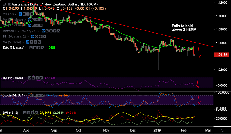 - AUD/NZD is trading 0.16% lower at 1.0412 at 0845 GMT, bias bearish.