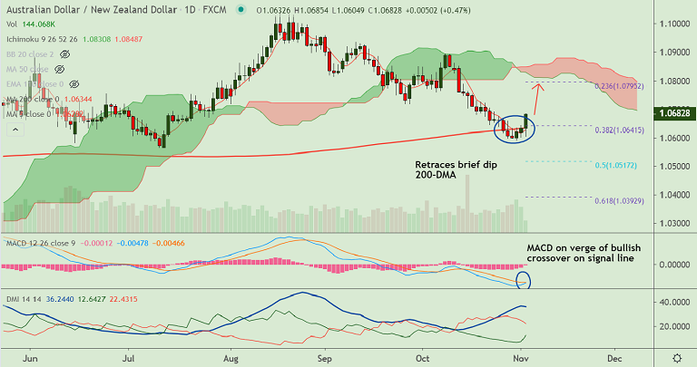 Summary: The pair has failed to extend break below 200-DMA and price has retraced above. Oscillators are showing a bullish rollover from oversold levels raising scope for further upside. Gains till 110-EMA at 1.0738 likely.