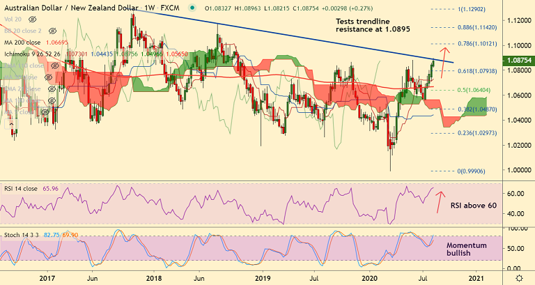 Price action has tested major trendline resistance at 1.0895, decisive break above will propel the pair higher.