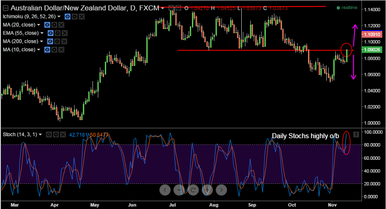 AUD/NZD has pulled out of the consolidation phase and re-entered its wide range channel between 1.0895 and 1st July highs of 1.1429. AUD led rally in response to surprisingly strong Australian jobs data has buoyed the pair higher.
