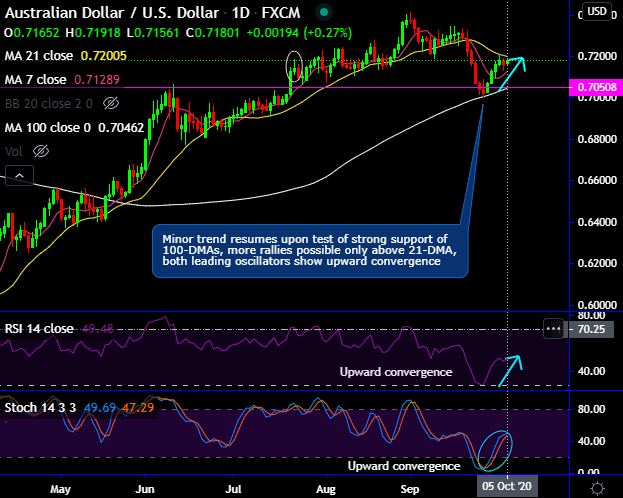 AUDUSD’s minor uptrend resumes upon the test of strong support of 100-DMAs, bulls have travelled more than 200 pips (i.e. from 0.7005 to 0.7209 levels).