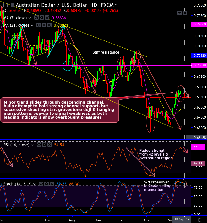 Technical chart and candlestick patterns: AUDUSD minor trend has been sliding through the sloping channel (refer daily chart). The pair has tested channel support and bounced back but restrained below stiff resistance of 0.6865 levels. Back-to-back bearish candles such as shooting star, gravestone doji and hanging man patterns have occurred at this juncture (refer circular area).