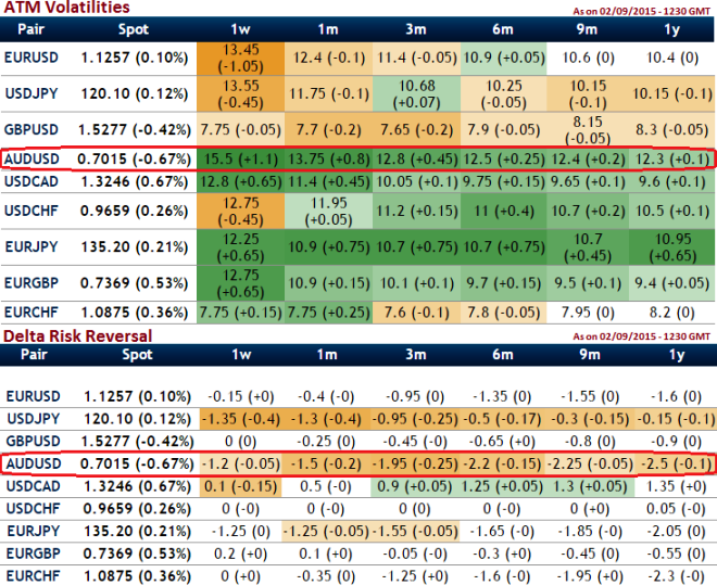 From the nutshells, it is understood that ATM vols and 25-delta risk reversals of AUDUSD the most expensive pair to be hedged for downside risks as it indicates puts have been over priced (downside protection is relatively more expensive). For the 3 months to 1 year time frame, delta risk reversal is getting closer to -2 to -2.55.