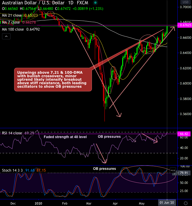 AUDUSD has continued the last week’s rallies, it has potential to break above 0.6762 levels, supported by improving global sentiment. Upswings above 7,21 & 100-DMA with bullish crossovers, minor uptrend likely intensify breakout above the stiff resistance. While both leading oscillators have entered in the overbought zone and to show selling pressures (refer daily chart).