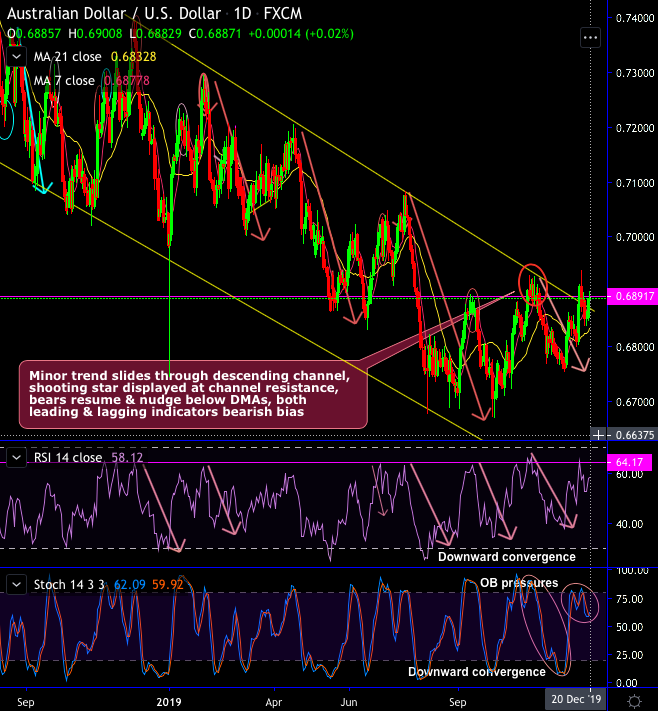 Technical chart and candlestick patterns: AUDUSD short-term trend has been sliding through descending channel (refer daily chart). Shooting stars and spinning top patterns have popped up at 0.6893 and 0.6884 levels respectively to signal weakness at the channel resistance. Consequently, the pair has shown the exhaustiveness in the interim upswings. The bulls attempt to bounce back but restrained at this juncture several times in the recent past.
