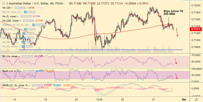 - AUD/USD rejected at session highs at 0.7166. The pair has slipped below 5-DMA and has broken below 1H 200 SMA.
