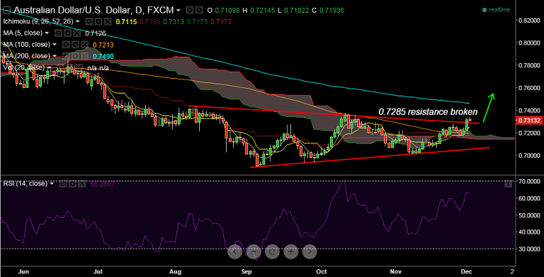 - Immediate resistance is located at 0.7335 (Dec 1 high), while support on the downside is seen at 0.7285 trendline