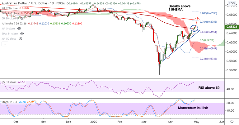 As the pair breaks above the 110-EMA resistance at 0.6506, scope rises for further upside. Next major hurdle lies at 20W SMA at 0.6554.