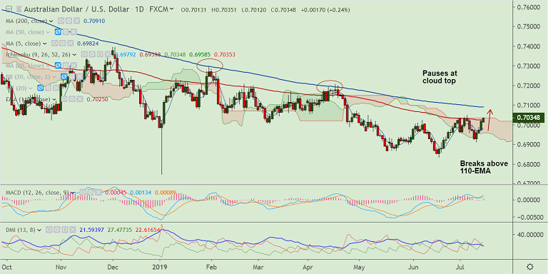 Support levels - 0.7025 (110-EMA), 0.6982 (5-DMA), 0.6958 (cloud base)