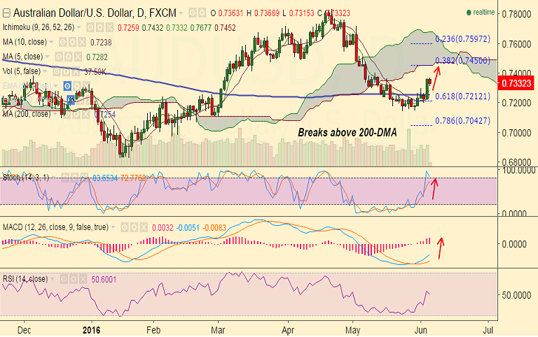 - Immediate resistance is 0.7368 (post NFP highs), break above can see upside till 0.74 and then 0.7450 (38.2% Fib).