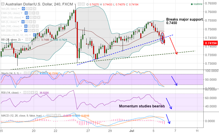 - We see break below 100-DMA, breach of major trendline support at 0.7450. Scope for downside drag till 0.7360.