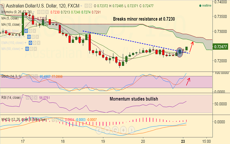 - On the 2-hourly charts, the pair has broken minor resistance at 0.7230, we see scope for gains upto 0.7290.