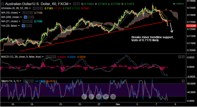- AUD/USD is currently trading at 0.7223. The pair broke below minor trend line support at 0.7256, we see scope for tests of 0.7170 levels in the near term.