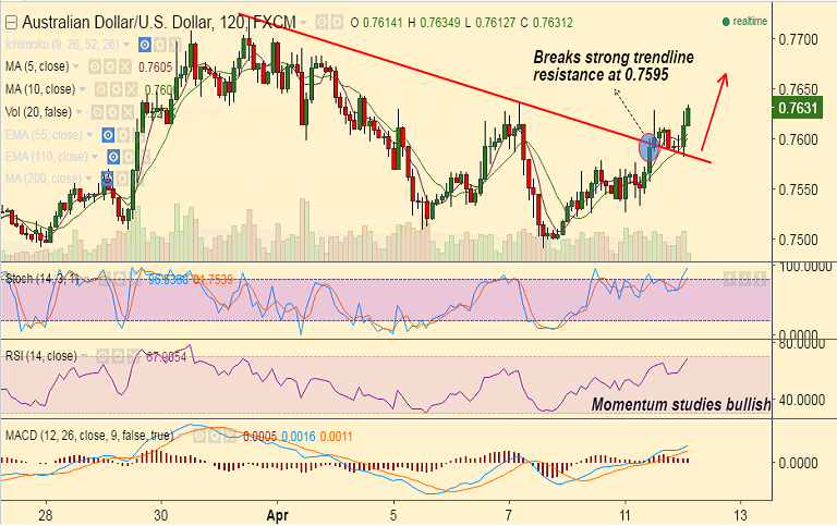 - AUD/USD broke strong trendline resistance at 0.7595, Technicals support further upside in the pair.