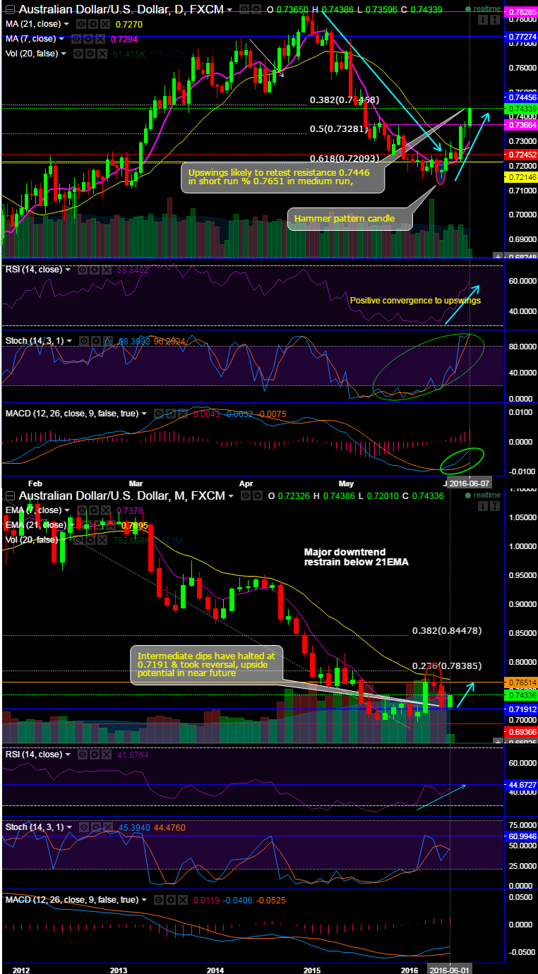 In recent past, the traders saw the AUD recovery as anticipated especially from 30th May ever since hammer pattern candle has occurred at 0.7181 levels.