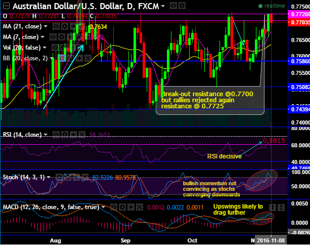 The broke above 0.7700 on the FBI news but again struggling to clear 0.7725 and slid below 0.77, it may target 0.7735-0.7780 area next (10 Aug peak) in the days to come.