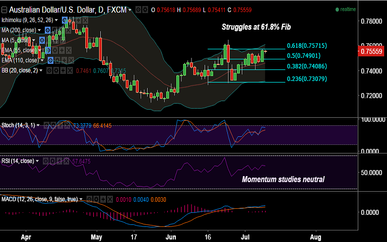 - Support on the downside is seen at 0.7516 (5-DMA), 0.75 and then 0.7490 (10-DMA).