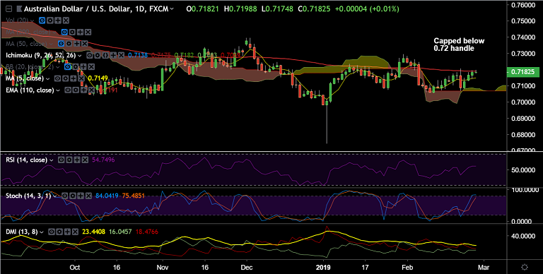 - Immediate support is seen at 5-DMA, while immediate resistance lies at 110-EMA at 0.7191.