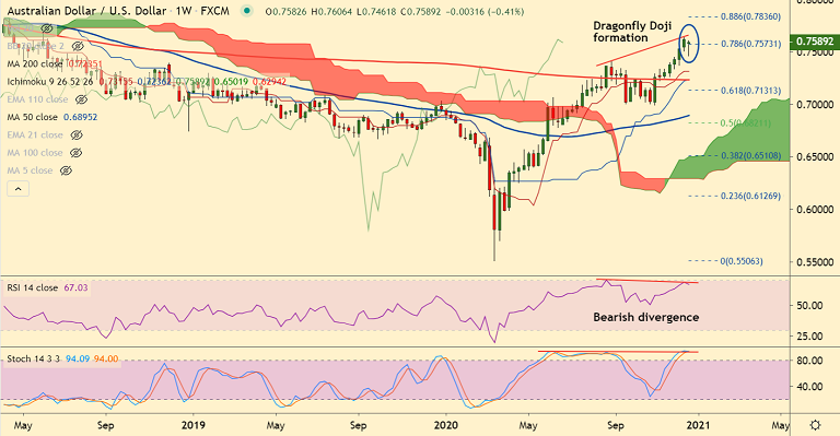 On the flipside, the pair has formed a 'Dragonfly Doji' on the weekly candle which shows buying at lows. Resumption of upside will see test of 88.6% Fib at 0.7836.