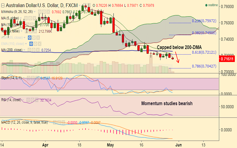 - Momentum studies are bearish, 200-DMA at 0.7251 weighs heavily on the upside, bearish invalidation only on breaks above.