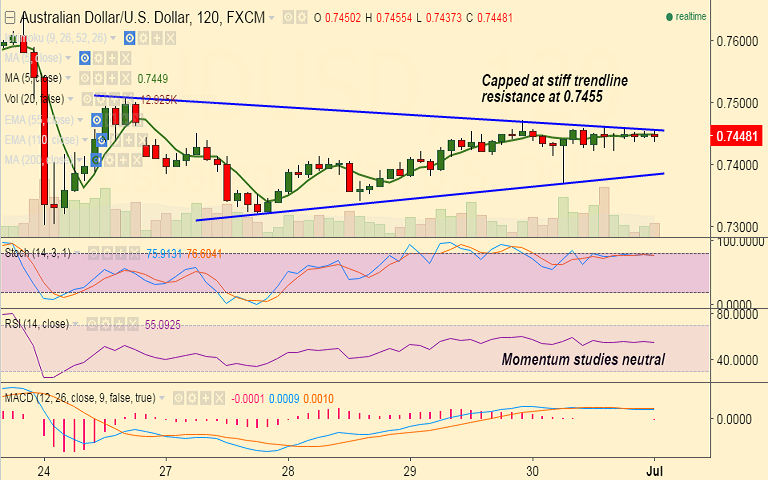 FxWirePro: AUD/USD capped below stiff resistance at 0.7455, poor Caixin China manufacturing PMI report weighs