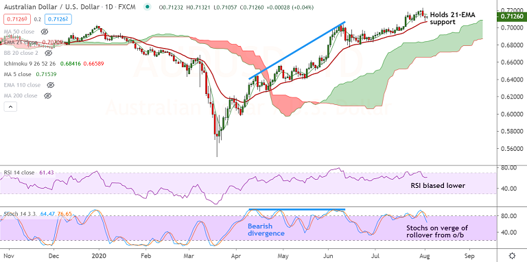 21-EMA is immediate support at 0.7071. Watch out for break below for downside till daily cloud ahead of 200-DMA at 0.6698.