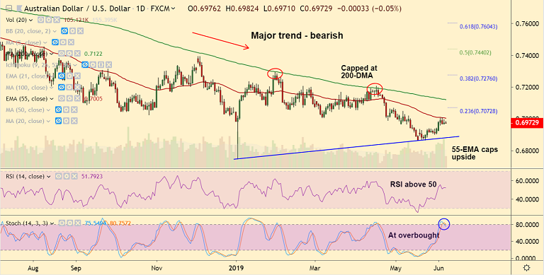 Breakout at 55-EMA will see some upside. Next major hurdle lies at 38.2% Fib at 0.7029.