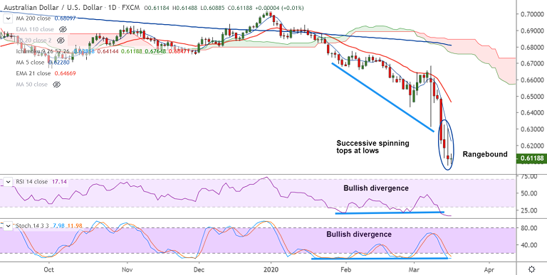 AUD/USD trades with a strong bearish bias. Slight bullish divergence on RSI and Stochs keeps scope for upside.