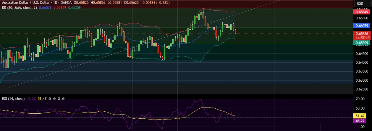 • Support is seen at 0.6536(Lower BB) and break below could take the pair towards 0.6503 (50%fib ).