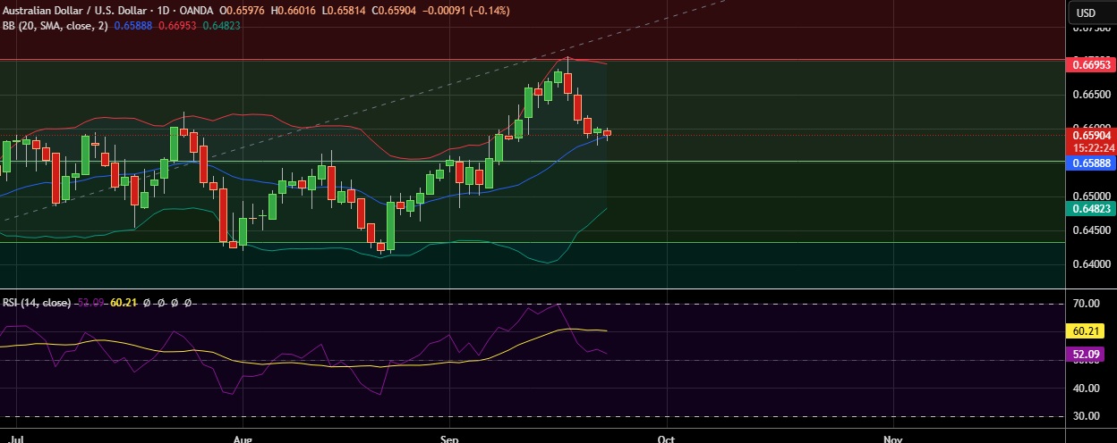 • Immediate resistance is located at 0.6659(Sep 18th high), any close above will push the pair towards 0.6697(Lower BB)