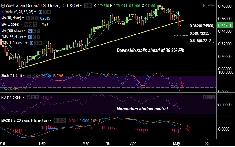 - AUD/USD downside stalls just shy of 38.2% Fib of Jan to April rise at 0.7450, further downside can be seen only on breaks below.